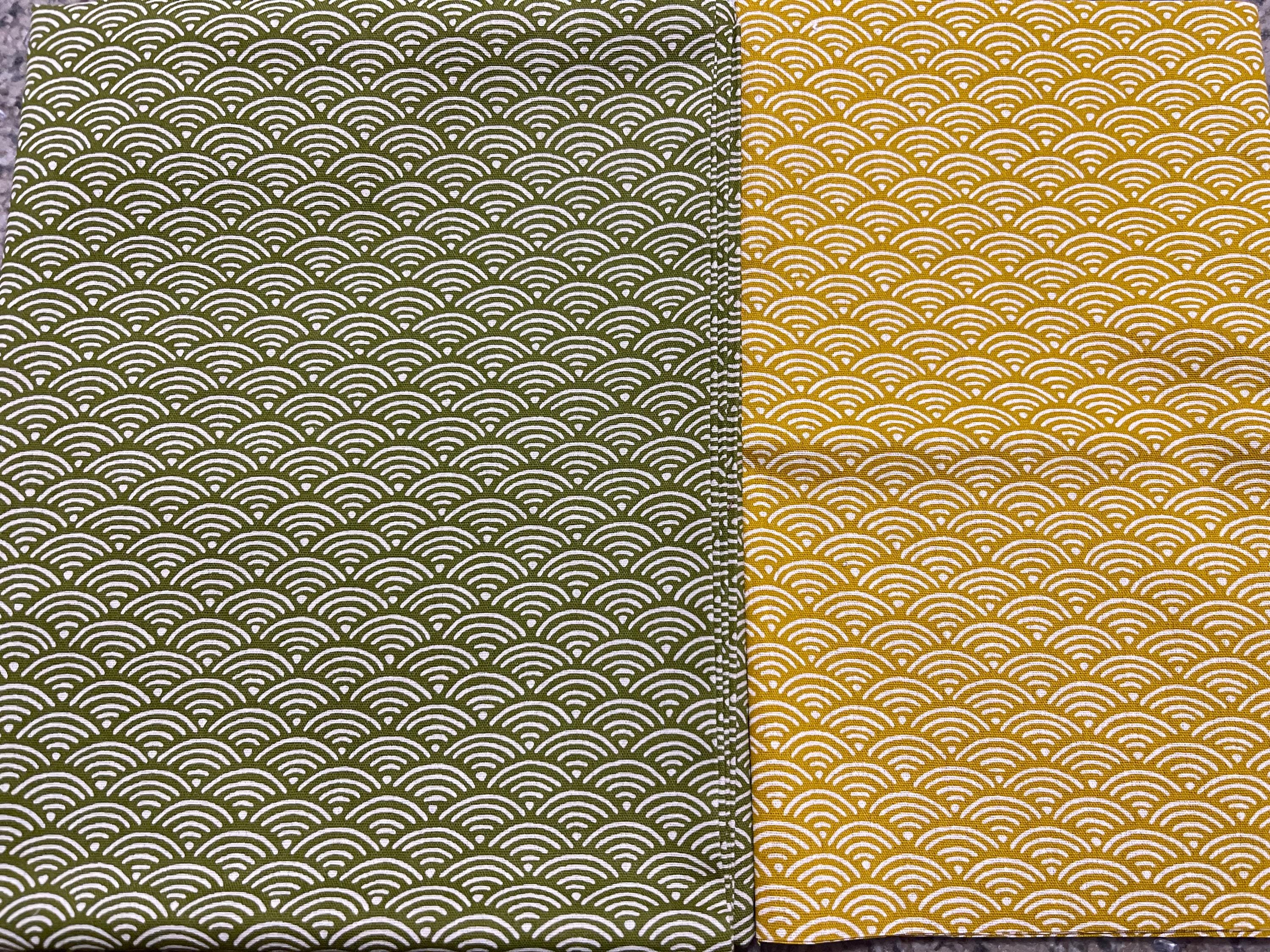 This is a new, cotton, quilting fabric. This fabric was created in Japan and has a printed pattern of off-white seigeiha (waves) over an olive green hued background.